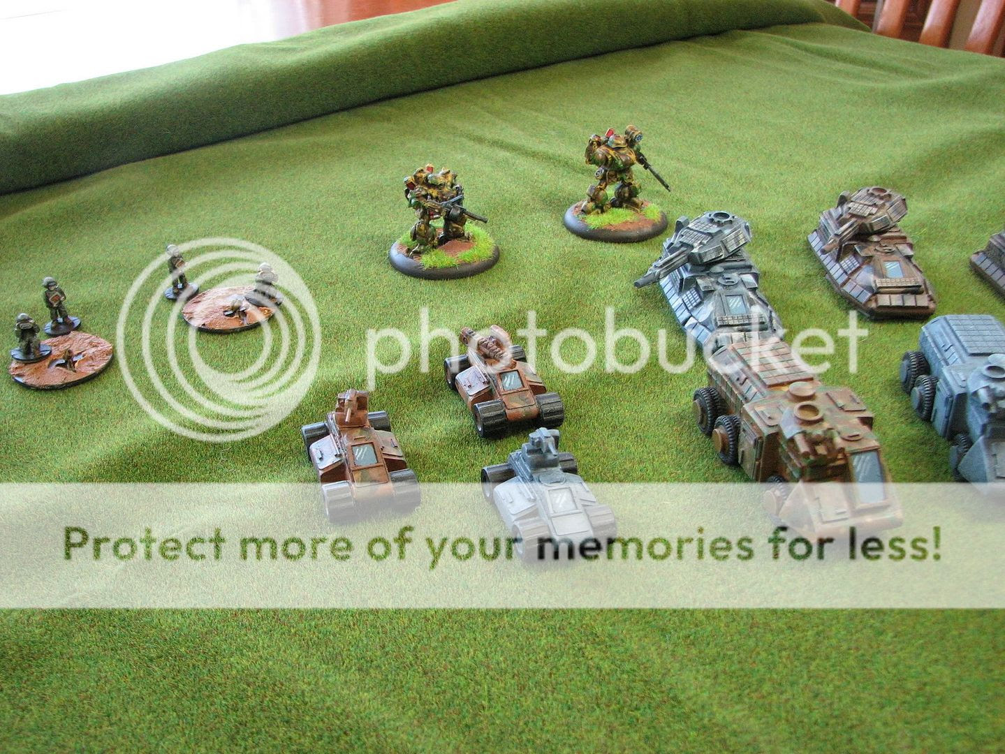 A few vehicle I painted up. These are all Mechwarrior clix vehicles that have been repainted(with some minor mods. I went with a pretty normal cammo scheme, sparayed the vehicles a krylon cammo green ultra flat. Added "stripes" of sandstone, then dabbed on smaller patches of a really dark midnight blue. A very thin brown wash follwed by a highlight of a lighter beige color. Then painted on the details. Extremely quick, and I'm happy with the results.